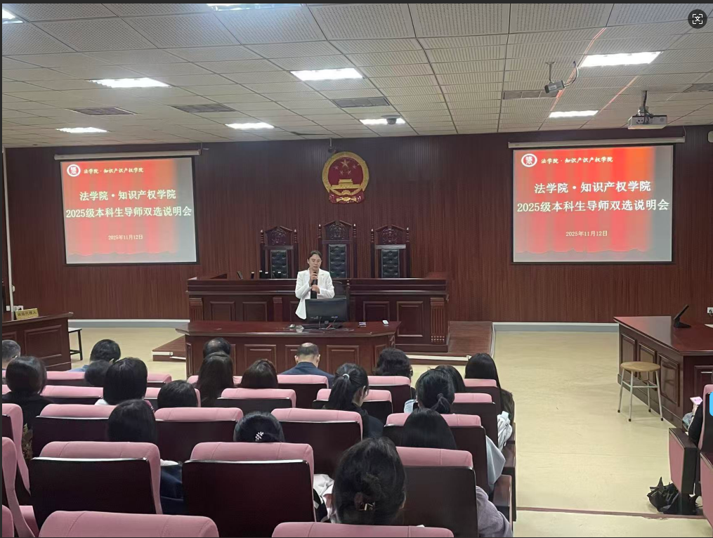 为全面落实立德树人根本任务,进一步推动本科生人才培养,搭建师生深度交流平台,11月12日中午在模拟法庭召开2025级本科生导师师生双选见面说明会,会议由张弘副院长主持,全体2025级学生及导师参加了会议。