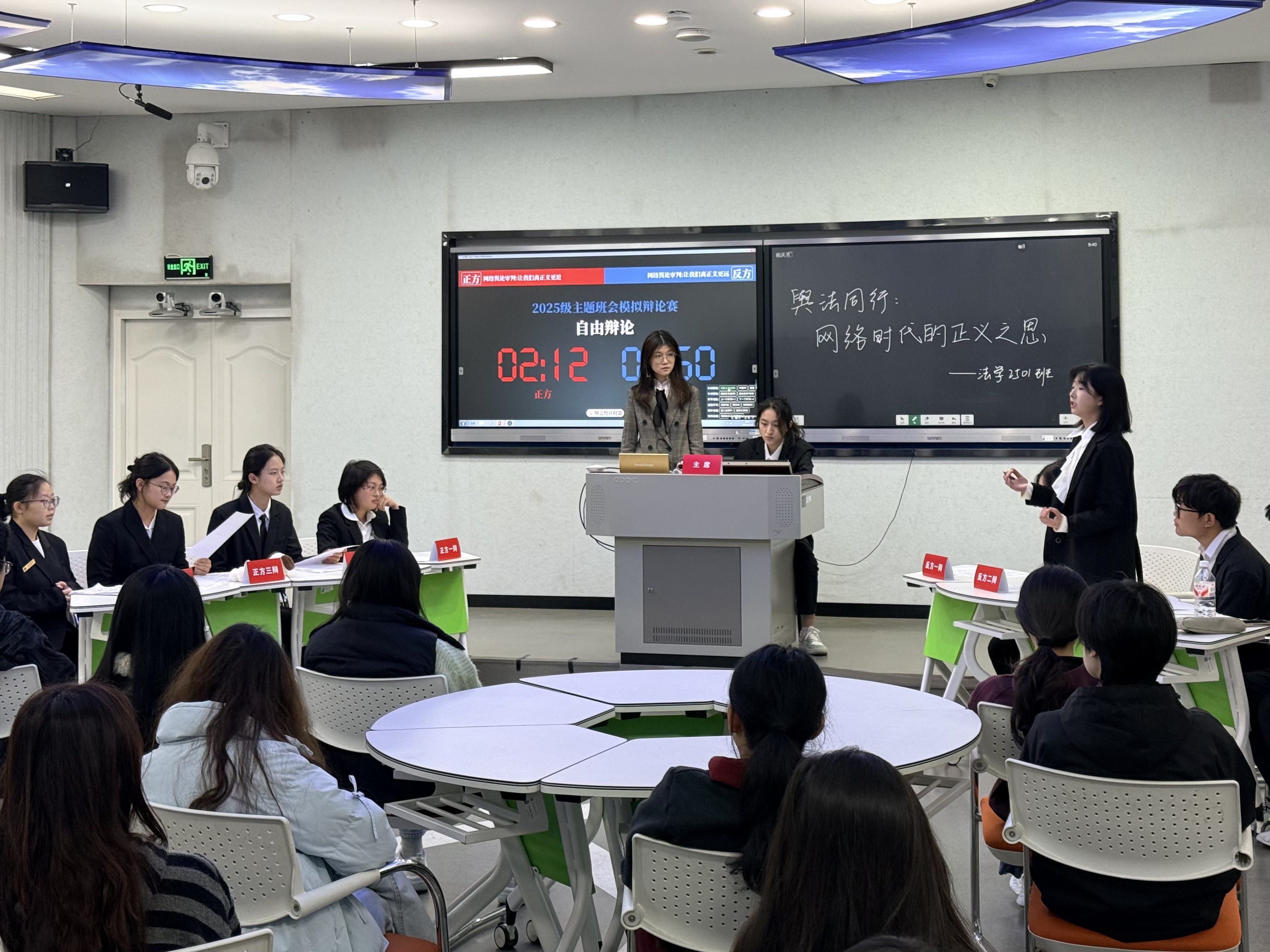 班会从“重庆某大学学生造谣老师案”切入,主持人詹佳语引导同学们关注网络舆论的传播效力与潜在风险。在随后的辩论环节,八位辩手围绕“网络舆论审判让我们离正义更近还是更远”展开观点交锋,从监督功能到程序正义,从情绪化审判到法治底线,展现出扎实的法学素养与思辨能力。